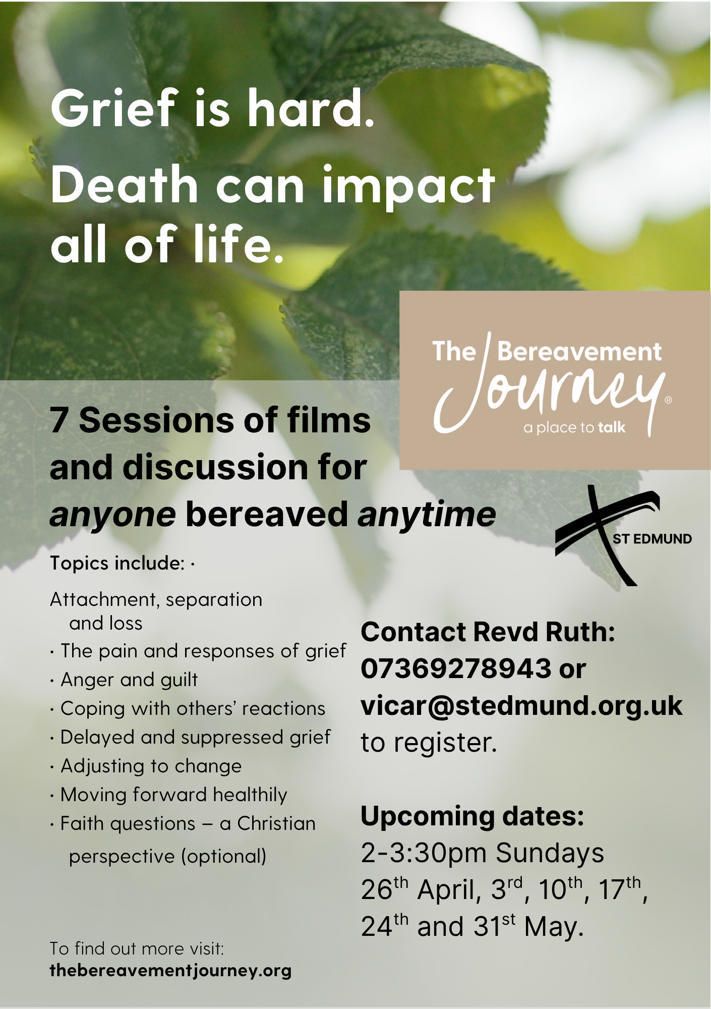 The death of a loved one changes life forever. Our regular support group can help you as you learn to live with the changes, and challenges. Join others who know what you are dealing with over tea, biscuits and friendly chat.
